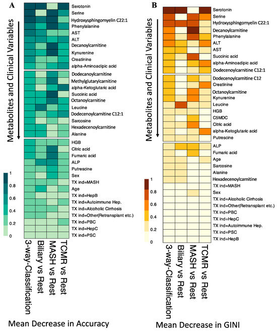 Variable Importance for the Random Forest Classification Models. (A). Shows the scaled Mean Decrease in Accuracy over all Out-of-Bag (OOB) cross-validated predictions. The drop in prediction performance for the 3-way classification, Biliary vs. Rest, and TCMR vs. Rest is highest when the metabolite serotonin is omitted. (B). The scaled GINI index, a measure of node impurity. Serotonin has the highest GINI index and is again considered the most important variable to split the data correctly by the 3-way classification, Biliary vs. Rest, and TCMR vs. Rest models. TX ind = primary indication for transplant.
