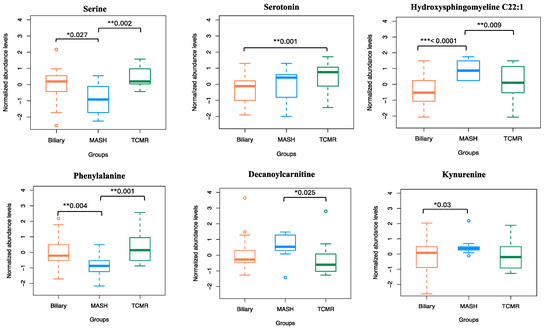 Serum samples from consented patients with MASH (n = 10), TCMR (n = 18), biliary complications (n = 27) were retrieved from the Multi Organ Transplant Program at the Ajmera Transplant Centre (UHN). Serum samples were processed for targeted metabolomics processing by The Metabolomics Innovation Centre (TMIC, Edmonton, AB, Canada, https://metabolomicscentre.ca) using a combination of direct injection mass spectrometry with a reverse-phase LC-MS/MS custom assay. This specialized assay enabled the accurate identification and quantification of 143 native metabolites encompassing amino acids, acyl carnitines, biogenic amines and their derivatives, uremic toxins, glycerophospholipids, sphingolipids, as well as various sugars. Mass spectrometric analysis was performed on an ABSciex 4000 Qtrap® tandem mass spectrometry instrument (Applied Biosystems/MDS Analytical Technologies, Foster City, CA, USA) equipped with an Agilent 1260 or Waters series UHPLC system. The samples were delivered to the mass spectrometer by an LC method followed by a direct injection (DI) method. The mass spectrometer was set to a positive electrospray ionization mode with a scheduled multiple reaction monitoring (MRM) scan. The Ion Spray voltage was set at 5500 volts and the temperature at 500 °C. The curtain gas (CUR), ion source gas 1 (GAS1), ion source gas 2 (GAS2) and collision gas (CAD) were set at 20, 40, 50 and medium, respectively. More details of the methodology were added to the Supplementary Materials.