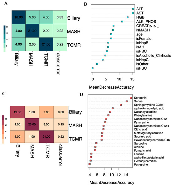 We additionally assessed our integrated three-way classification model, which combines clinical variables and metabolites, alongside two other three-way classification models trained solely on a single data type: (i) clinical variables alone, and (ii) metabolites alone. Our Random Forest classifier, when trained on solely clinical variables, produced an overall OOB estimate of the error rate at 25.93%. At the individual class level, depicted in Figure 7A, the model distinguished both MASH and TCMR groups, with OOB error estimates of 22.2% and 33.3% for the Biliary group. The three-way clinical-only model achieves an overall accuracy of 73.37%. The top clinical predictors were ALT and AST, as shown in Figure 7B. While these conventional clinical variables can indicate liver graft injury, they are not specific to the etiologies of graft pathology.