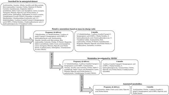 Plasma samples from pregnancy (mothers), delivery (mothers and infants), and four months postpartum (mothers and infants) were analyzed with untargeted liquid chromatography–mass spectrometry (LC-MS). Instrument settings have previously been described in detail []. To note, samples from pregnancy and delivery were analyzed separately from the samples collected four months postpartum using two different instruments. Features from the untargeted analysis (not yet annotated, referred to by mass-to-charge ratio and retention time) were selected from a literature survey and communication performed as part of the EU project food phytochemicals matter for cardiometabolic health (FOODPHYT) under the joint programming initiative a Healthy Diet for a Healthy Life (not published) []. The features with putative identifications based on mass-to-charge ratio (N = 63 in samples from pregnancy and delivery and N = 29 in samples from four months postpartum) were correlated to a wide range of food items (N = 61). Features of interest for further investigation were selected based on plausibility to be found in or related to the intake of the correlated food item. Maternal samples with the highest intensity of these features were reanalyzed with mass spectrometric fragmentation (MSMS) to obtain product ion spectra for compound annotation (Figure 1 and Table S1).