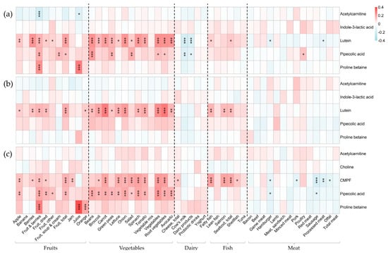Linear regression between annotated metabolites in maternal plasma and food intake during (a) pregnancy, (b) at delivery, and (c) at four months postpartum. The models were adjusted for age, education, and parity. All metabolites and food variables were standardized to have the mean of zero and standard deviation of one. The magnitude of each regression coefficient is denoted by color, whereby red indicates a positive association and blue represents a negative association. Darker shades of these two colors indicate stronger associations. p-values were FDR adjusted, and significant associations are denoted as * p < 0.05, ** p < 0.01, and *** p < 0.001.