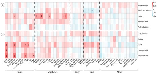 Linear regression between annotated metabolites in infant plasma and maternal food intake during (a) delivery and (b) at four months postpartum. The models were adjusted for age, education, and parity. All metabolites and food variables were standardized to have a mean of zero and standard deviation of one. The magnitude of each regression coefficient is denoted by color, whereby red indicates a positive association and blue represents a negative association. Darker shades of these two colors indicate stronger associations. p-values were FDR adjusted, and significant associations are denoted as * p < 0.05, ** p < 0.01, and *** p < 0.001.