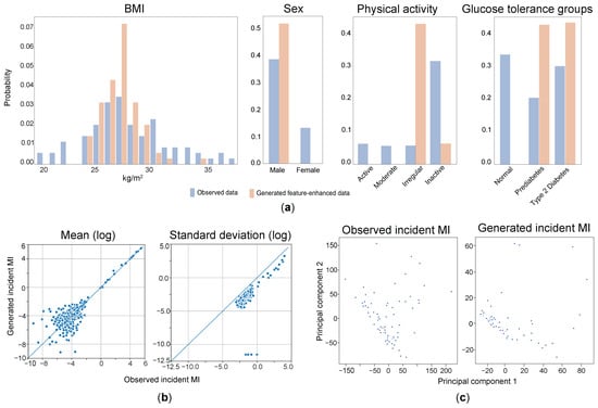 Comparison between feature-enhanced data and observed incident myocardial infarction cases. (a) Four plots illustrate the distributions of four clinical variables (BMI, sex, physical activity, and glucose tolerance groups) in the generated and observed datasets, respectively. The distribution of a subset of eigenvalues for each variable is shown. We observe a normal distribution trend in the generated data that closely resembles the observational data for BMI, but male sex and irregular and inactive physical activity, as well as prediabetes and type 2 diabetes in glucose tolerance groups, are mainly present in the generated dataset. (b) Here, we present the scatter plots showing the correlations between the generated and observed data. The points on the scatter plot are close to the diagonal line y = x, indicating that the mean and standard deviation of the generated data are similar to those of the observed data. (c) After-dimensional reduction using PCA (Principal Component Analysis); the trend of the feature-enhanced data is closer to the incident cases. We selected the most significant features for enhancement, and the results of the PCA analysis show that the feature-enhanced data aligns more closely with the observed incident MI cases.