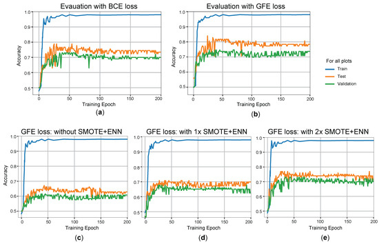 Using the GFE loss function and the combined dataset, we further evaluated the MLP model without SMOTE+ENN (Figure 4c), with one-time SMOTE+ENN (Figure 4d), and with two-times SMOTE+ENN (Figure 4e). The prediction accuracy of the model on the validation datasets improved, with the highest accuracy achieved using two-times SMOTE+ENN. The MLP model achieved prediction accuracies of approximately 60%, 65%, and 70% for the validation dataset without SMOTE+ENN, with one-time SMOTE+ENN, and with two-times SMOTE+ENN, respectively (Figure 4c–e).