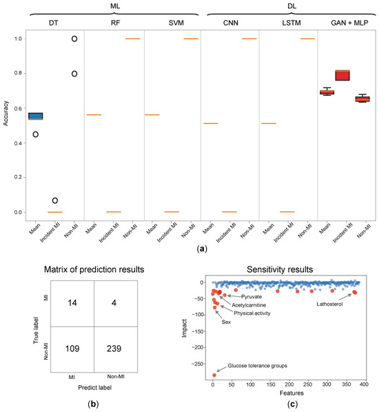 In addition to our proposed DL (GAN with MLP) model, we constructed conventional ML models (DT, RF, and SVM) and DL models (CNN and LSTM) using the observed dataset to compare and assess the approaches. Due to the imbalanced data, with a large quantity of non-MI participants and limited quantity of incident MI cases, these models struggled to effectively learn from the incident cases. Consequently, to achieve the highest prediction accuracy, these models predicted all data points as non-MI, resulting in 100% accuracy for non-MI cases and 0% accuracy for incident MI cases with DT, RF, SVM, CNN, and LSTM approaches (Figure 5a).
