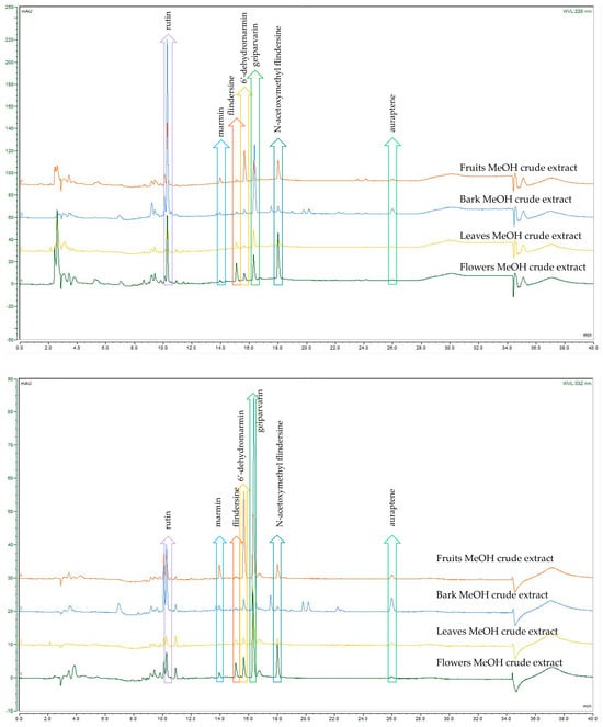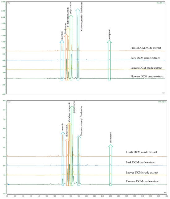 A comparison of the analytical HPLC chromatographic profiles of the crude DCM and MeOH extracts (all analysed at a concentration of 2 mg/mL) was conducted. These extracts were obtained from the four different plant parts of G. parviflora, namely the flowers, leaves, bark, and fruits. The motivation was to conduct a comparison of these extracts to observe which common metabolites were present, which were dominant, and if any other metabolites were present. The analysis permitted similar and dominant metabolites such as the coumarins, alkaloids, and the glycoside flavonol, rutin, as well as derivatives from these compound classes to be compared. Although these compound classes are ubiquitous within the Rutaceae and the plant kingdom, the coumarin geiparvarin 3 has not been reported outside of the Geijera genus and it would be useful to conduct further research to establish if this compound can be hypothesised as being a potential chemotaxonomic marker. It was noted that the most abundant compounds present in the various plant part extracts differed only in their quantities, with no additional metabolites observed for the different plant parts studied. This is evident in the analytical HPLC chromatograms for the plant parts of the crude extracts when analysed and assessed at the two wavelengths of 220 nm and 332 nm, respectively (see Figure 2 and Figure 3). The bark extracts contained a larger variety of alkaloid and coumarin derivatives than the extracts from the leaves, fruits, and flowers. In contrast, the flower extracts were composed almost entirely of large proportions of the dominant compounds, with few other minor constituents present. This was observed in the HPLC chromatograms of both the DCM and MeOH crude extracts. Geiparvarin 3 and N-(acetoxymethyl) flindersine 2 were the two most dominant metabolites in all extracts, as evidenced by the largest peaks observed in the chromatograms.