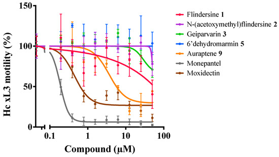Dose-response curves of G. parviflora compounds on the motility of xL3s of H. contortus at 168 h.
