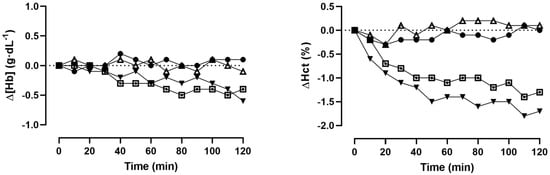 Figure 1 presents the absolute changes in [Hb] and Hct over the course of the 120-min observational phase. A two-way repeated measures ANOVA revealed that there was no statistically significant time or trial arm effect on [Hb] and Hct in both the CON (p = 0.96–0.99), GLU (p = 0.75–0.99), and RIN (p = 0.52–0.99) trial arms. In the ISO trial arm, [Hb] was significantly lower at t70 (14.3 ± 1.4 vs. 13.9 ± 1.4 g·dL−1, p = 0.02) and t80 (13.8 ± 1.3 g·dL−1, p < 0.01) when compared to t0. All other within-trial arm comparisons were insignificant (p = 0.19–0.99).
