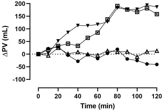Absolute changes in PV from the baseline (t0) until 120 min (t120) post fluid consumption (● = CON, ▲ = GLU, ▼ = RIN, and ⊡ = ISO).