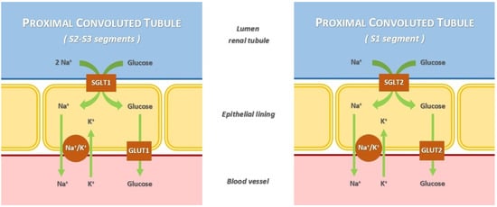 The action of SGLT1 and SGLT2 is complementary; their coupling with the specific glucose transporters (GLUT1 and GLUT2) and Na+/K+-ATPase forms a single mechanism able to recover glucose from the renal filtrate. When the kidney reabsorption capacity is exceeded, glycosuria starts to appear (Figure 1) [].