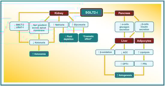 An SGLT2-i lowers blood glucose levels by increasing its urinary excretion; this reduces pancreatic β-cells’ insulin secretion. The fall in circulating insulin levels leads to a reduction in the insulin antilipolytic action and consequent stimulation of the free fatty acids (FFAs) production. FFA released from adipocytes are brought to the liver and oriented toward the ketogenic pathway and converted to ketone bodies by β-oxidation []. Moreover, insulin stimulates acetyl-CoA carboxylase (ACC) activity, with the production of malonyl-CoA, a strong inhibitor of carnitine palmitoyltransferase-I (CPT-I). CPT-I triggers the FFA transport into mitochondria; in this way, the decrease in the circulating level of insulin promotes the production of ketone bodies through the activation of CPT-I and the β-oxidation rate [].