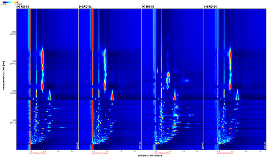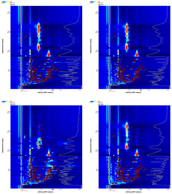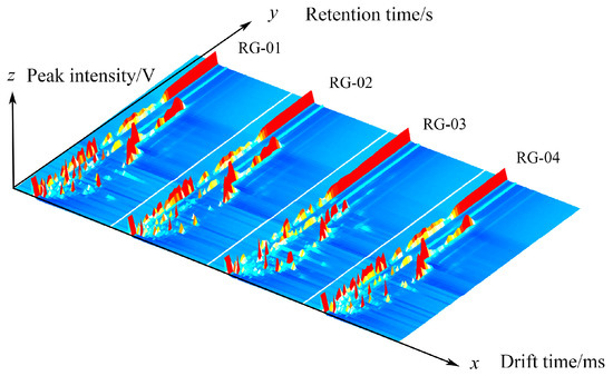 We further analyzed the sample’s gas phase ion migration spectrum in detail by combining the two-dimensional top view and difference plot. Figure 2 shows a two-dimensional view of VOCs in four batches of cinnamon, with the horizontal axis representing the ion drift time and the vertical axis representing the retention time. The red vertical line represents the reaction ion peak. Each bright spot represents a volatile component on either side of the reaction ion peak. In order to determine the analyte, it must be quantified, and the color depth represents the volatile compound content. The higher the content of the component, the darker the color and the larger the bright spot. Red indicates a higher content of the corresponding component, and white indicates a lower content. It is also possible to visually compare the VOCs in the four batches of cinnamon in Figure 2.