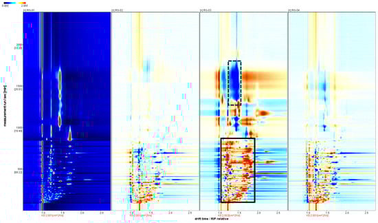 As shown in Figure 3, the spectrum of the RG-01 sample is used as a reference, and the spectra of the other samples are subtracted from the reference to compare the differences between them. If the VOCs in the target sample and the reference sample are the same, the subtracted background is white, while red indicates a higher concentration of the substance in the target sample. At the same time, blue indicates a lower concentration of the substance in the target sample. We can clearly see the differences between the four batches of cinnamon through differential spectra. RG-03 has significantly less substances in the dotted black border than RG-01, and RG-01 has many red signal peaks, indicating that RG-03 has significantly more substances than RG-01.