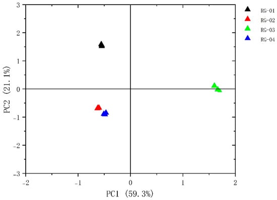 The PCA of VOCs in four groups of cinnamon samples, RG-01, RG-02, RG-03, and RG-04, was performed using Origin pro 2023b software. The results are shown in Figure 6. The contribution rate of PC1 is 59.3%, and the contribution rate of PC2 is 21.1%, with a cumulative contribution rate of 80.4%. The small distance between Sample 1, Sample 2, and Sample 4 indicates that their differences are small. At the same time, Sample 3 has a clear distance from the other three cinnamon groups, indicating a significant difference between Sample 3 and the other three groups of cinnamon. Certain differences exist in the content of VOCs between the four batches of cinnamon.