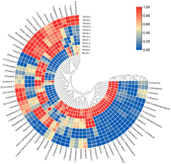 Using a heatmap, data differences between groups are intuitively represented by color depth changes. A total of 66 volatile component peaks from the four groups, RG-01, RG-02, RG-03, and RG-04, were imported into TBtools software (v2.026) for CA. The results are shown in Figure 7. For the four groups of cinnamon from different origins, the clustering characteristics of cinnamon from the same origin are obvious. The clustering characteristics of the second and fourth groups are obvious, and the difference between the third group and the other three groups is significant. The elements were as follows: 2-Undecental, 2,4-Decadienal, 3-carene D, 1-Hexanol D, Ethyl 2-methylpropanoate D, Ethyl 2-methylpropanoate M γ- Terpinene D, (+)-Limene M, heptanal D, Linalool oxide M α- Terpinene D, Cinnamyl alcohol, Butyl 2-methylbutanoate D, Linalool oxide D, 3-methyl-but-1-yl acetate D, and 3-methyl-but-1-yl acetate M γ-. The content of Terpinene D and Butyl acetate D in RG-03 is higher than that of the other three groups.