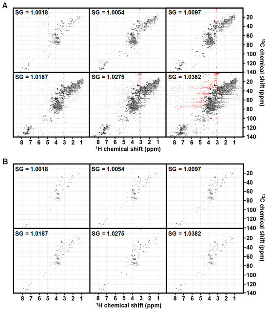 Figure 1. HSQC spectra of identical urine across an SG range adjusted to noise or sum-based cutoff. (A) Spectra from a pooled urine sample at 10× noise cutoff across a range of SG from most dilute (1.0018) to concentrated (1.0382). (B) The same spectra are plotted using a sum-based threshold of 7 × 10−4*sum of positive peak intensity. Spectral colors indicate positive peaks (black) and negative peaks (red).