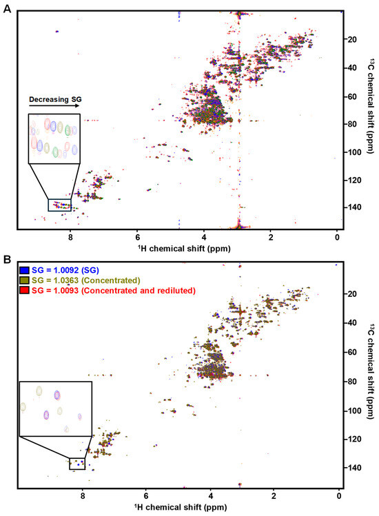 Figure 2. SG impacts chemical shift. (A) HSQC spectral overlay of same pooled urine at six different SG values as described in Figure 1. Many resonances display chemical shift perturbation as a function of SG, such as those for histidine and 3-methylhistamine (inset). (B) HSQC overlay of the same pooled urine (SG = 1.0092) (blue), concentrated 5× (SG = 1.0363) (green) or concentrated and then re-diluted (SG = 1.0093) (red). Re-diluted samples resolve the chemical shift perturbations observed in concentrated samples.