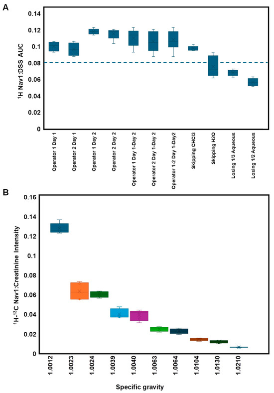 Figure 4. Navigator 1 monitors sample processing biases. (A) 1H Nav1:DSS AUC ratio is a sensitive indicator for variations in sample processing, wherein a ratio of <0.08 (dotted line) signals suboptimal metabolite extraction. (B) 1H-13C HSQC Nav1:creatinine intensity ratio correlates with SG. Five replicates for each condition were tested with standard deviation represented by error bars.