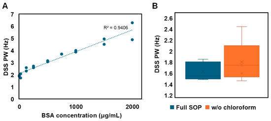Figure 5. DSS is a Navigator for protein contamination. (A) The 1H DSS peak width (PW) at half-height increases as a function of protein concentration. (B) In metabolites extracted from urine, DSS PW at half-height is ≤1.8 Hz following the full SOP. Samples in which protein precipitation is skipped (i.e., without the chloroform addition step) have a greater range and higher average peak width value. Five replicates for each condition were tested with standard deviation represented by error bars.