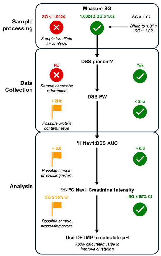 Figure 7. Flowchart of Navigator checkpoints. Sample processing begins with a measurement of SG. Samples with an SG < 1.0024 are too dilute for analysis; if between 1.0024 and 1.02, the sample is ready for preparation, and if SG > 1.02, sample should be diluted to between 1.01 and 1.02. After 1H data is collected, observe whether DSS is present. If absent, sample is unable to be referenced and results will be unreliable. If DSS is present, verify the PW is less than 2 Hz. If not, check shim values and flag the sample for possible protein contamination. To analyze data, verify the 1H Nav1:DSS AUC ratio is greater than 0.8, otherwise flag the sample for possible errors. For the beginning phase of sample analysis, verify the 1H-13C Nav1:creatinine intensity ratio estimates SG within the 95% CI of measured SG. Finally, use 1H DFTMP chemical shift position to determine initial and final pH of the sample to inform proper clustering. Abbreviations: SG: specific gravity; DSS: deuterated sodium 2,2-dimethyl-2-silapentane-5-sulfonate; PW: peak width at 1/2 height; Nav1: Navigator 1; CI: Confidence interval; DFTMP: 1,1-difluoro-1-trimethylsilanyl methylphosphonic acid.