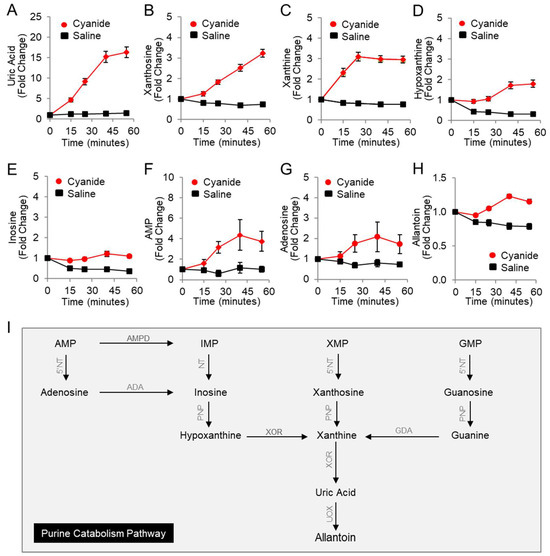 Combining mass spectrometry-based metabolite profiling with in vivo models of cyanide exposure, we have begun to characterize the metabolite disturbances downstream of cyanide exposure [14,15]. In rabbits exposed to sublethal cyanide and a pilot study of humans treated with nitroprusside, we have previously detected an increase in three purine metabolites in the circulation [14]. Specifically, plasma levels of inosine, hypoxanthine, and uric acid were increased during exposure to a nonlethal dose of cyanide. These three metabolites constitute part of the purine degradation pathway. This catabolic pathway breaks down purine nucleotides and nucleosides including adenosine monophosphate (AMP), guanosine monophosphate (GMP), xanthosine monophosphate (XMP), adenosine, guanosine, and xanthosine [16]. Ultimately, xanthine oxidoreductase (XOR) generates the end product of purine catabolism, i.e., uric acid, which is excreted in urine. The observation that uric acid increased was surprising because cyanide has been shown to inhibit the activity of XOR in vitro via extraction of sulfur atoms or binding iron atoms in the enzyme [17,18,19,20]. Thus, these enzyme activity studies with XOR in vitro suggest that in vivo purine catabolism to uric acid should also be inhibited by cyanide.