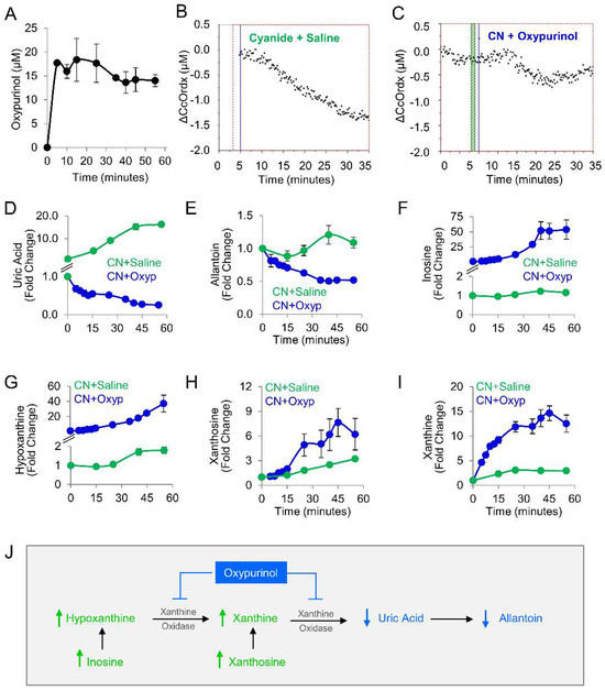 Oxypurinol abrogates the deleterious effects of cyanide on cytochrome c oxidase in rabbits exposed to cyanide. (A) Pharmacokinetic profile of oxypurinol in rabbits. Cytochrome c oxidase redox state (ΔCcOrdx) in the skeletal muscle of cyanide-exposed rabbits treated with (B) saline (9 mL IV; n = 9) or (C) oxypurinol (50 mg/kg IV; n = 4); horizontal lines denote the start of cyanide and treatment. Metabolites were measured in the plasma of cyanide-treated animals that received saline (n = 12) or oxypurinol (n = 4): (D) uric acid; (E) allantoin; (F) inosine; (G) hypoxanthine; (H) xanthosine; and (I) xanthine (see Table 3 for p values and q values). (J) Depiction of the expected effects of oxpurinol administration in this model. ↑ denotes increased levels; ↓ denotes decreased levels.