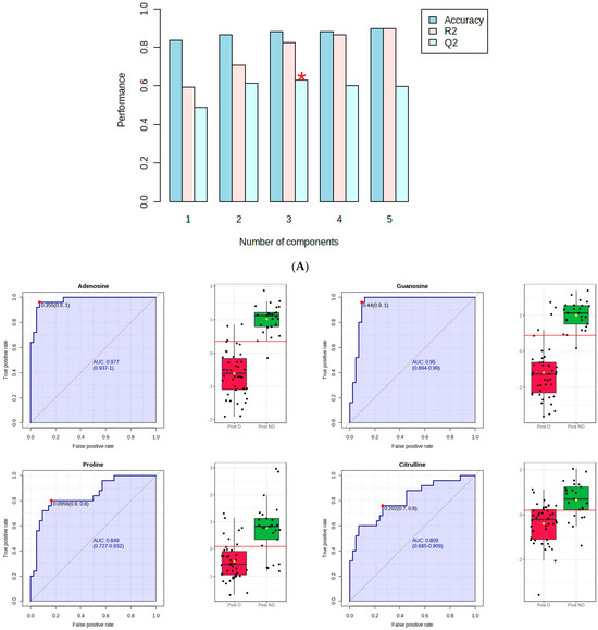 Figure 1A shows that component 3 of the PLS-DA model had Q2 of 0.62, R2 of 0.82, and an accuracy of 0.89. The red star indicates the best classifier.