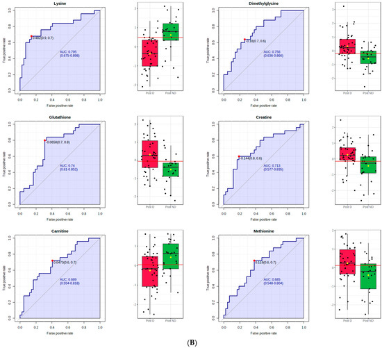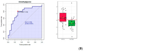 Figure 2B shows the ROC curve analysis of the significant polar metabolites. Across the ROC curve, we evaluated the area under the curve (AUC). AUC < 0.5 indicates that the test has no diagnostic value, AUC 0.8–0.9 indicates good accuracy, and AUC > 0.9 suggests that the diagnostic test has high accuracy [33]. Red indicated premenopausal women with depression and green indicated premenopausal women without depression. A horizontal line is in red indicating the optimal cutoff.