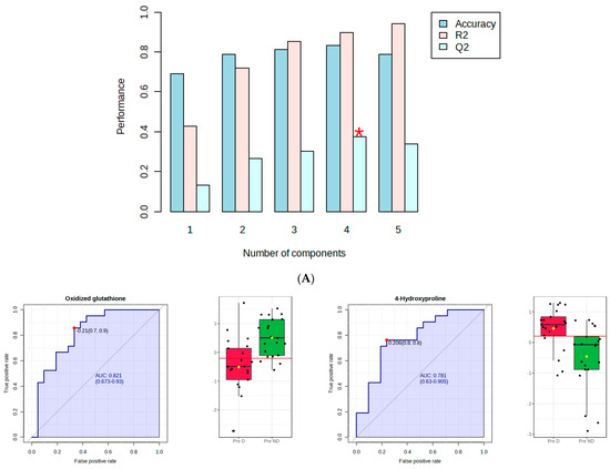 Figure 2A shows that component 4 of the PLS-DA model had Q2 of 0.38, R2 of 0.89, and an accuracy of 0.83. The red star indicates the best classifier.