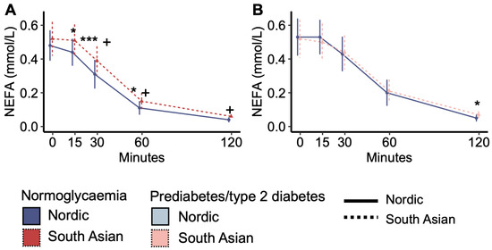 Plasma non-esterified fatty acid (NEFA) concentrations during the oral glucose tolerance test. (A) Plasma NEFA concentrations in normoglycaemic women and (B) in women with prediabetes/type 2 diabetes. + p < 0.05 interaction effect between the ethnic groups from time 0. * p < 0.05, and *** p < 0.001 ethnic group difference. Data are medians with interquartile ranges. NO = Nordic. SA = South Asian. Blue colour and solid line = Nordics with normoglycaemia. Red colour with stapled line = South Asians with normoglycaemia. Light blue colour with solid line = Nordics with prediabetes/type 2 diabetes. The light red colour and stapled line = South Asians with prediabetes/type 2 diabetes.