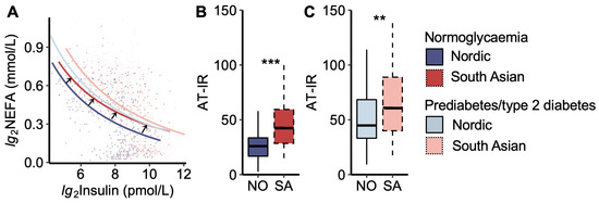 Adipose tissue insulin resistance index. (A) Plasma non-esterified fatty acid (NEFA) vs. insulin concentrations during the oral glucose tolerance test. The black arrows indicate that the curve for normoglycaemic South Asians is shifted upwards to the right compared to normoglycaemic Nordics, approaching the curves for the prediabetes/type 2 diabetes groups. The coloured dots represent each women. (B) The adipose tissue insulin resistance index (AT-IR), the product of fasting NEFA and insulin levels, in normoglycaemic women and (C) women with prediabetes/type 2 diabetes. NO = Nordic. SA = South Asian. Box plots show medians, 25–75 percentiles, and min/max ranges. ** p < 0.01, and *** p < 0.001 ethnic group difference.
