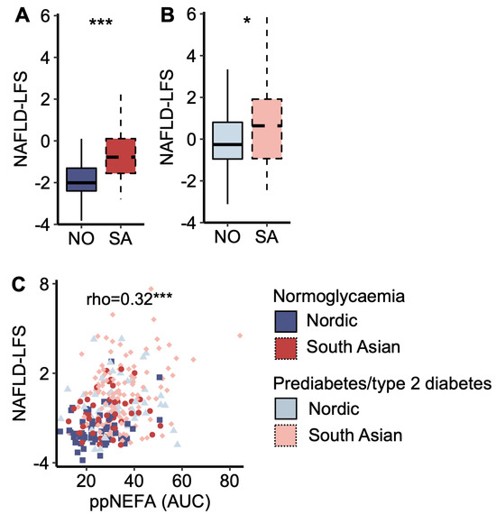 A marker of liver fat content. (A) The non-alcoholic fatty liver disease liver fat score (NAFLD-LFS) in Nordic and South Asian women with normoglycaemia and (B) prediabetes/type 2 diabetes. (C) A scatter plot of NAFLD-LFS scores and post-prandial (pp) non-esterified fatty acid (NEFA) concentration (area under the curve (AUC) from the oral glucose tolerance test (OGTT)). * p < 0.05 and *** p < 0.001. Box plots show medians, 25–75 percentiles, and min/max ranges. NO = Nordic. SA = South Asian.
