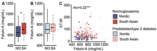 Fetuin-A. (A) Plasma fetuin-A concentrations in Nordic and South Asian women with normoglycaemia and (B) prediabetes/type 2 diabetes. (C) A scatter plot of adipose tissue insulin resistance (AT-IR) indexes as a function of plasma fetuin-A concentrations. * p < 0.05, and *** p < 0.001. Box plots show medians, 25–75 percentiles, and min/max ranges. NO = Nordic. SA = South Asian.