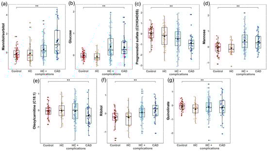 - Qamar, W.; Alqahtani, S.; Ahamad, S.R.; Ali, N.; Altamimi, M.A. Untargeted GC–MS investigation of serum metabolomics of coronary artery disease patients. Saudi J. Biol. Sci. 2020, 27, 3727–3734. [Google Scholar] [CrossRef] [PubMed]