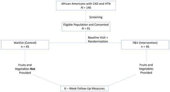 Overall Study Design. The sample population included African American individuals of 18 years or older who were diagnosed with chronic kidney disease and hypertension. Individuals were screened to identify eligibility. Consented participants were measured at baseline and randomized to the control or intervention group. The control group did not receive fruit and vegetables, whereas the intervention group was provided with fruit and vegetables. After 6 weeks, all participants were measured for post-intervention changes.