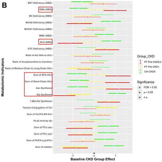Plasma from blood samples collected for all study participants combined into one group at baseline were analyzed. Figure 2 displays the expression of metabolomic analytes (A) and metabolic indicators (B) in forest plots by CKD group effect. Data for both plots were separated by CKD stages (0, 1, and 2/3) to distinctively model varying expression levels of metabolites and indicators pre-intervention. The forest plot also highlights the levels of expression of other metabolites and indicators by CKD stages for comparison; however, they are not statistically significant (lightly shaded bars with circles). Significant metabolites and indicators (dark shaded colored bars) of interest are highlighted with a red box.