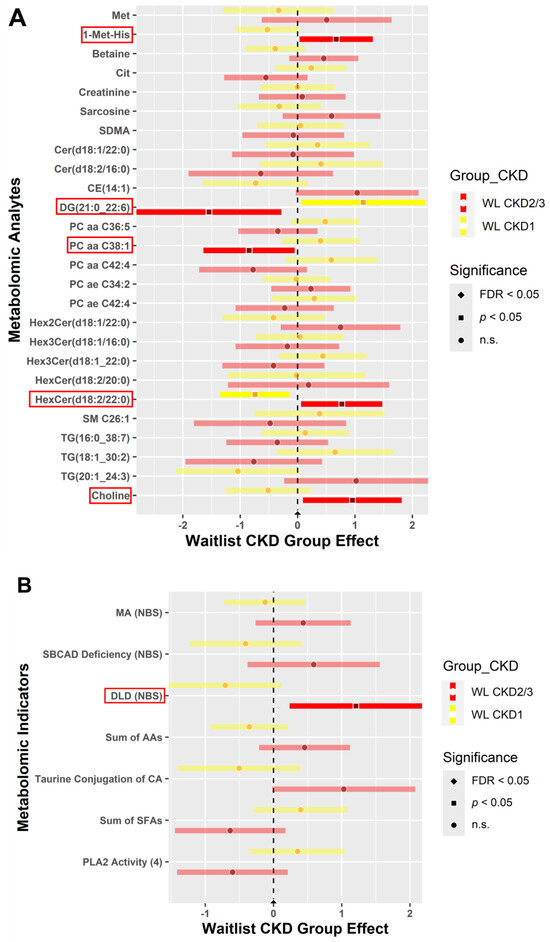 A comparison of 6 weeks post-intervention and baseline results showed changes in metabolite and indicator expression levels (post- minus pre-intervention) for the WL (Figure 3) and FV (Figure 4) groups separately. Forest plots representing the changes in metabolite (A) and indicator (B) expression levels between baseline and post-intervention for participants randomized to the WL group are shown in Figure 3. The WL-CKD2/3 group demonstrated higher expression of metabolites 1-Met-His, hexosylceramide—HexCer (d18:2/22:0), and choline, but lower levels of diglyceride—DG (21:0_22:6) and phosphatidylcholine—PC aa C38:1 than the WL-CKD1 group (p < 0.05) (Figure 3A). In addition, the WL-CKD2/3 group demonstrated higher levels (p < 0.05) of the DLD (NBS) indicator (Figure 3B). Significant metabolites and indicators (dark shaded colored bars) of interest are highlighted with a red box.
