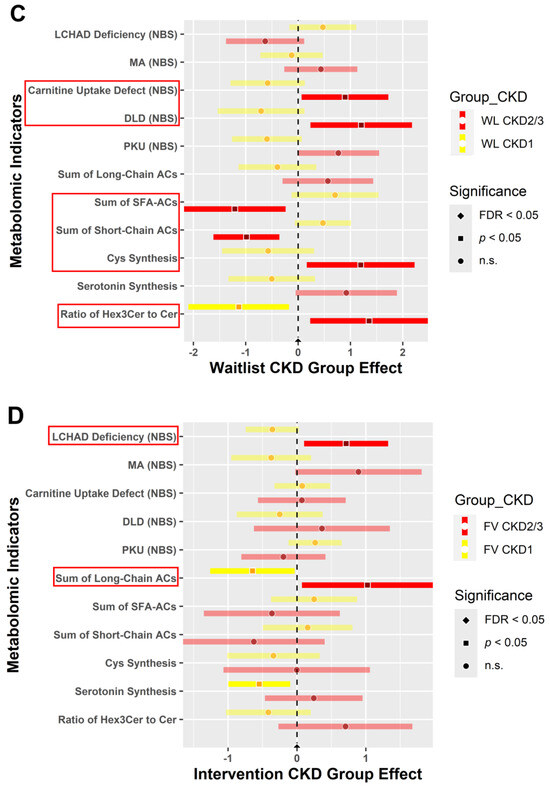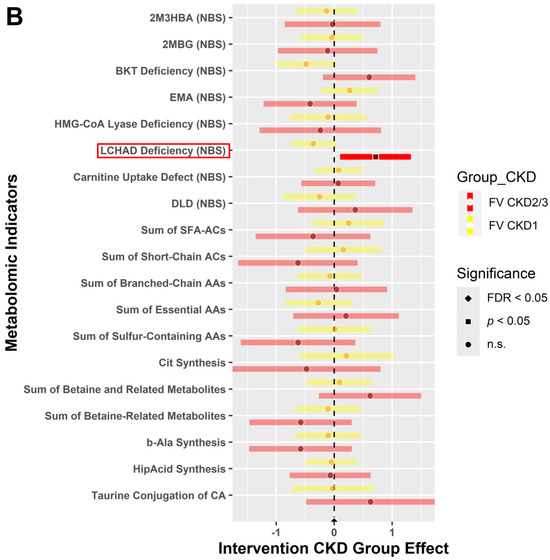 Furthermore, forest plots illustrating the changes in metabolite (A) and indicator (B) expression levels between baseline and post-intervention for participants randomized to the FV group are shown in Figure 4. Intervention participants displayed fewer significant metabolites compared to the WL participants in Figure 3. In the comparison of pre- and post-intervention, the FV group portrayed lower expression levels of phosphatidylcholine—PC aa C30:2 (p < 0.05) in participants with CKD2/3 (Figure 4A). Additionally, Figure 4B shows that the indicator for long-chain 3-hydroxyacyl-coenzyme A dehydrogenase (LCHAD) deficiency (NBS) was higher in FV participants with CKD2/3 (p < 0.05). As mentioned before, the lightly shaded bars with circles indicate nonsignificant levels of expression. Significant metabolites and indicators (dark shaded colored bars) of interest are highlighted with a red box.