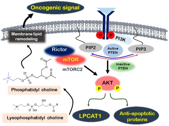 Regulation of melanoma through the Akt signaling activation mechanism. In melanoma, activated PI3K stimulates Akt, which then promotes the expression of antiapoptotic proteins and LPCAT1. LPCAT1 transforms lysophosphatidyl choline into phosphatidyl choline, activating oncogenic signals by remodeling membrane lipids. Additionally, the mTORC2 complex, comprising mTOR and Rictor, further enhances Akt phosphorylation.