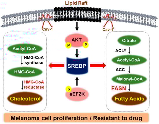 Regulatory mechanisms by SREBP in melanoma. In melanoma, lipid rafts, activated by Caveolin-1, can induce phosphorylation of Akt and promote SREBP activity. Additionally, eEF2K phosphorylation can activate SREBP, which then stimulates fatty acid uptake and cholesterol synthesis through FASN and HMG-CoA reductase. This activation contributes to the proliferation of melanoma cells and their resistance to drugs.