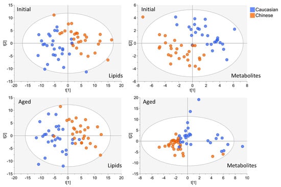 Partial least squares discriminative analysis of both Initial and Aged lipid and metabolite datasets for Ethnicity discrimination (Caucasian vs. Chinese). For each model, participant symbols were colored according to ethnicity (Caucasian blue symbols, Chinese orange symbols).