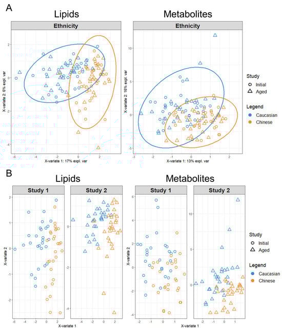 Sparse tuning of block PLS–DA lipid and polar metabolite models for the discrimination of Ethnicity via the MixOmics MINT analysis. For each model, participant symbols were colored according to ethnicity (Caucasian blue symbols, Chinese orange symbols). (A) Sparse tuned block PLS–DA plots of respective lipid and metabolite Ethnicity models, calculated from the combination of Initial and Age study features as collective discrimination analysis. (B) Sparse tuned block PLS–DA plots of respective lipid and metabolite Ethnicity models as separated by Initial (Study 1) and Aged (Study 2) panels for comparison of discrimination analysis.