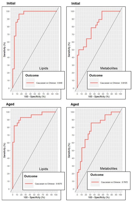 After penalty tuning and establishing each Initial and Aged sPLS–DA model for ethnic discrimination, we chose to evaluate the predictive quality of each trained model with ROC curves (Figure 3). ROC curves and their calculated AUC values indicated a greater performance in predicting the cohort’s ethnic discrimination from both Initial lipid and Initial polar metabolite models relative to their respective Aged models. Additionally, ROC analysis determined that both Initial and Aged lipidomic models were stronger prediction models for ethnic discrimination than their polar metabolite models.