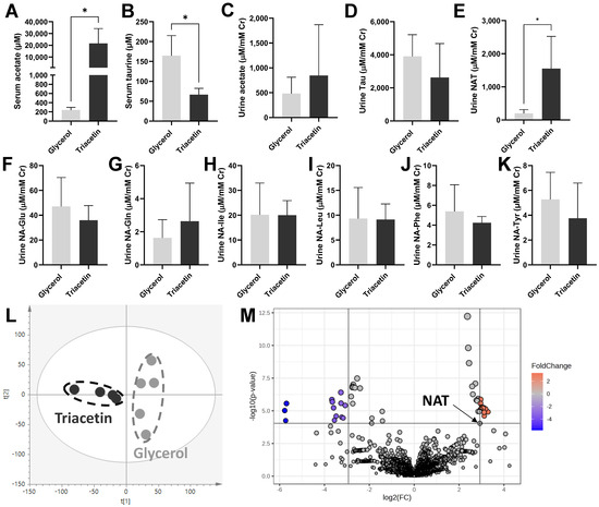 Concentrations of targeted serum and urine metabolites and the multivariate modeling of urine metabolome after triacetin dosing. Serum samples were collected 2 h post dosing. Urine samples were collected after housing mice individually in metabolic cages for 24 h post dosing (n = 5 in the glycerol group, n = 4 in the triacetin group). (A) serum acetate, (B) serum taurine, (C) urine acetate, (D) urine taurine, (E) urine NAT, (F) urine N-acetyl-glutamate (NA-Glu), (G) urine N-acetyl-glutamine (NA-Gln), (H) urine N-acetyl-isoleucine (NA-Ile), (I) urine N-acetyl-leucine (NA-Leu), (J) urine N-acetyl-phenylalanine (NA-Phe), (K) urine N-acetyl-tyrosine (NA-Tyr). * indicates p-value < 0.05 from non-paired t-test. (L) Scores plot of the PCA model on combined positive- and negative-mode data on the urine metabolome, in which t[1] and t[2] stand for the principal components 1 and 2, respectively. (M) Volcano plot of the urinary metabolites contributing to the differentiation between the triacetin- and glycerol-dosing groups. The fold-change (FC) and p-value of individual metabolites are the ratios of triacetin vs. glycerol control and their statistical significances, respectively. The metabolites with a greater FC and more significant p-value (red colored) than NAT (marked) were selected for further analysis (Table S3).