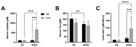 Serum acetate and taurine and urinary NAT after 15-day ethanol dosing. Serum and urine samples were collected from the control (Ctl) group (n = 4) and the ethanol (EtOH) feeding group (n = 8) on day 0 (D0) before feeding the semi-liquid diets and on day 15 (D15) of the feeding. (A) serum acetate, (B) serum taurine, (C) urine NAT. Two-way ANOVA tests were conducted on the rank-transformed data, followed by Fisher’s LSD tests to examine the differences within the same treatment across days and between two treatments on the same day (** p < 0.01, *** p < 0.001, **** p < 0.0001).