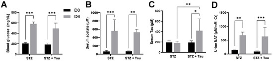 Blood glucose, serum acetate and taurine, and urinary NAT after STZ dosing and taurine supplementation. Serum and urine samples were collected from the STZ alone (STZ) treatment group (n = 4) and the SZT plus 2% (w/v) taurine in drinking water (STZ+Tau) treatment group on day 0 (D0) before STZ treatment and on day 15 (D15) after the treatment (n = 4 in each treatment group). (A) Blood glucose, (B) serum acetate, (C) serum taurine, (D) urinary NAT. Two-way ANOVA tests were conducted on the rank-transformed data, followed by Fisher’s LSD tests to examine the differences within the same group across days and between the two groups on each day (* p < 0.05, ** p < 0.01, *** p < 0.001).