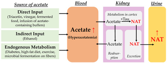 The sources of hyperacetatemia and the metabolic events leading to the increased urinary NAT. Blood acetate can be increased by diverse direct and indirect exogenous inputs as well as various endogenous metabolic events. In the kidney, after elevated acetate reacts with taurine to form NAT in the renal cortex, free acetate may undergo extensive reabsorption while NAT is readily excreted into urine, making urinary NAT, instead of urinary acetate, highly responsive to hyperacetatemia.