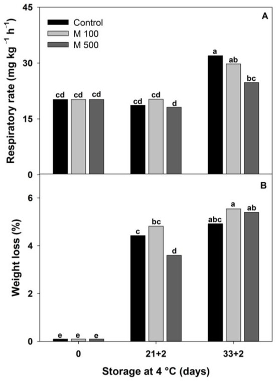 Selection of melatonin treatment at different concentrations: 0 µM (Control), 100 µM (M100), and 500 µM (M500). (A) Respiration rate. (B) Weight loss of red bell pepper fruits during storage at 4 °C for 33 days and then being transferred at room temperature for 2 days (33 + 2). Different letters indicate significant differences according to Fisher’s LSD test (p < 0.05).