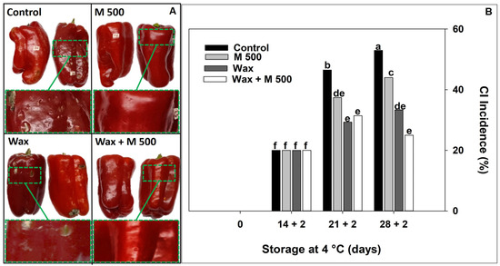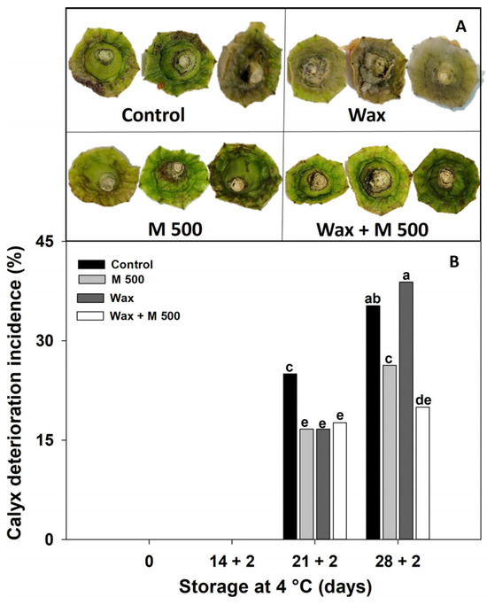 Effect of treatments: 0 µM (Control), 500 µM melatonin (M500), wax, and combined (wax + M500). (A) Calyx appearance at 28 + 2 days. (B) Incidence of calyx deterioration of red bell pepper fruits during storage at 4 °C for 28 days and then being transferred at room temperature for 2 days (28 + 2). Different letters indicate significant differences according to Fisher’s LSD test (p < 0.05).