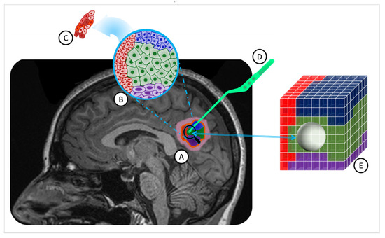 ITH in a solid brain tumor and MRI-guided stereotactic biopsy overlaid on a T1W MR image. (A). A solid brain tumor outlined by a yellow border, comprising four distinct cell subpopulations (in red, blue, green, and purple) with associated inflammation in pink. (B). Macroheterogeneity within cell subpopulations, displaying reduced cytoplasm and enlarged nuclei in some cells. (C). Microheterogeneity among tumor cells of the same subpopulations. (D). The pituitary tweezer is used for stereotactic biopsy. (E). The tumor sample volume is represented as a sphere, centered on the biopsied location, including two cell populations (blue and green). (ITH: intratumoral heterogeneity; MRI: magnetic resonance imaging; T1W: T1-weighted; MR: magnetic resonance).